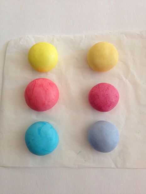 Porcelana fría se puede teñido muy fácilmente amasando en una pequeña cantidad de colorante de la pintura o los alimentos. Las bolas en el lado izquierdo de la imagen fueron teñidas con alimento líquido colorante, los de la derecha con el arte de acrílico pintura. Cada una de estas bolas pesa entre 1 y 1.5 onzas y usé unos 4-5 gotas de colorante de comida y 2-3 gotas de pintura.