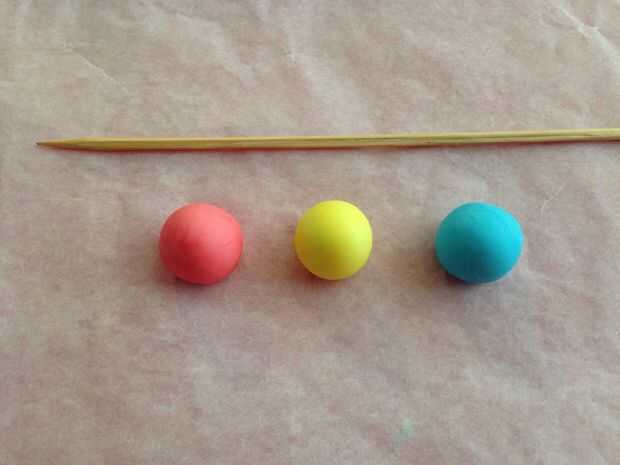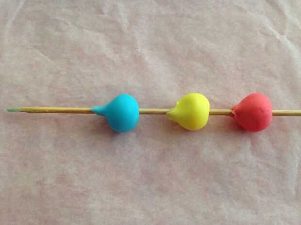 Para hacer granos, formar las bolas (o cualquier forma quieras) y luego haga un orificio a través del centro con algo fuerte y puntudo. Usé los pinchos de bambú, que no son ideales, hacen agujeros muy grandes y la arcilla tiende a pegarse a ellos, pero trabajan bastante bien en este caso.