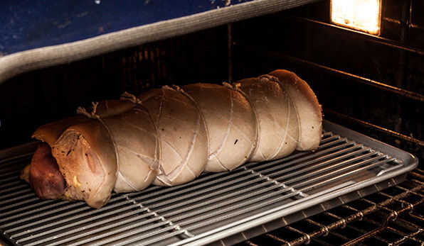 Porchetta se considera el plato del último cerdo de la mayoría de los italianos.   Tradicionalmente hecho de cerdos entero deshuesados, este porchetta se hace de cortes disponibles.  Utilizar la mejor carne de cerdo para el mejor sabor.  Fuertemente