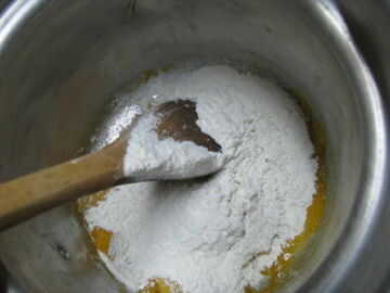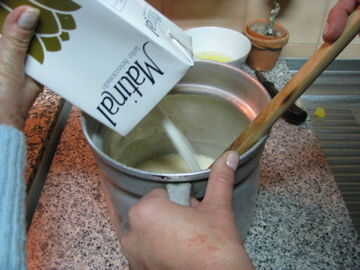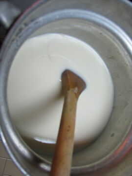 Ahora, es el momento de añadir el ingrediente principal: la laite o leche. Se necesita un litro entero, que muy lentamente se añaden a la crema mientras se mezcla constantemente.