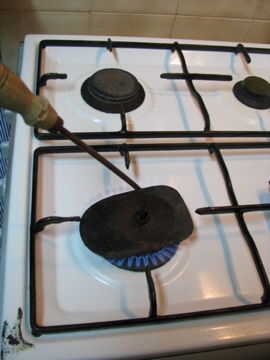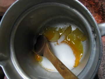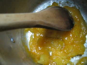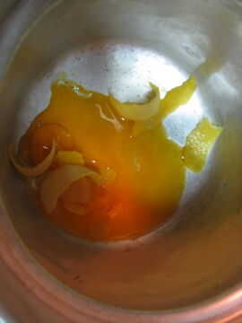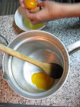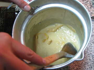 Ponga la plancha en la olla. Tendrá que estar muy caliente! Mezclar las yemas con la ralladura de limón como en las fotos. Use una olla profunda pequeña. Luego agregar el azúcar. harán 3-4 cucharas, la cantidad depende de tu gusto personal. Prefiero la laite crema no debe ser demasiado dulce. Entonces, usted necesita algunos (sólo 3-4 cucharadas) de harina y mezclar muy bien.