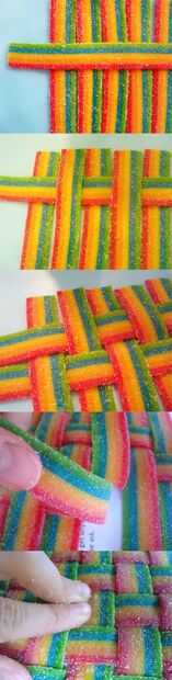 Dejando una pulgada de espacio en la parte superior, comenzar a tejer una de las tiras restantes de caramelo horizontalmente, sobre y debajo de las filas verticales. Agarra la pieza siguiente y tejer directamente por debajo de la anterior, tejer bajo en que forma un patrón del basketweave. Continuar alternando con las tiras restantes. El collage de fotos del proceso puede ayudar a si todo parece confuso.
