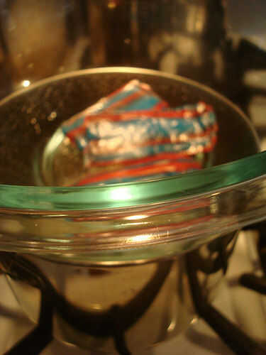 Ahora, configurar tu caldera doble. Coloque tres caramelos de cabezas huecas (el tipo regular) en la parte superior, junto con el agua y el azúcar impalpable. Calor en el medio, revolviendo cada pocos minutos. Mientras que al principio el azúcar, el agua y el caramelo serán siendo muy separados, como derrite, la mezcla será espesa. A ver ahora por qué era una buena idea utilizar el caramelo en el mismo esquema de color, el color se funde juntos. Puede ser feo Si utilizas diferentes dulces de color (como lo hice la primera vez) pero le gusto fino. Promesa. Pero aún así, esto no será la parte más bonita del proceso.
