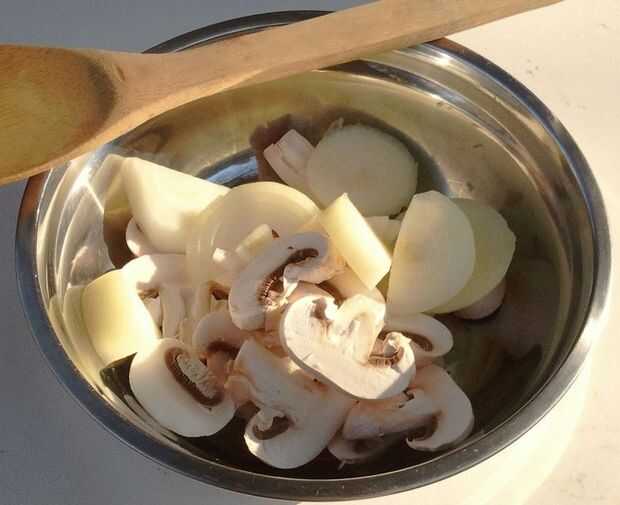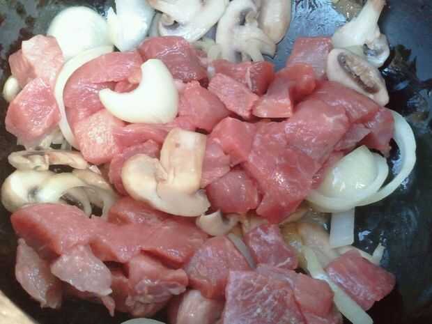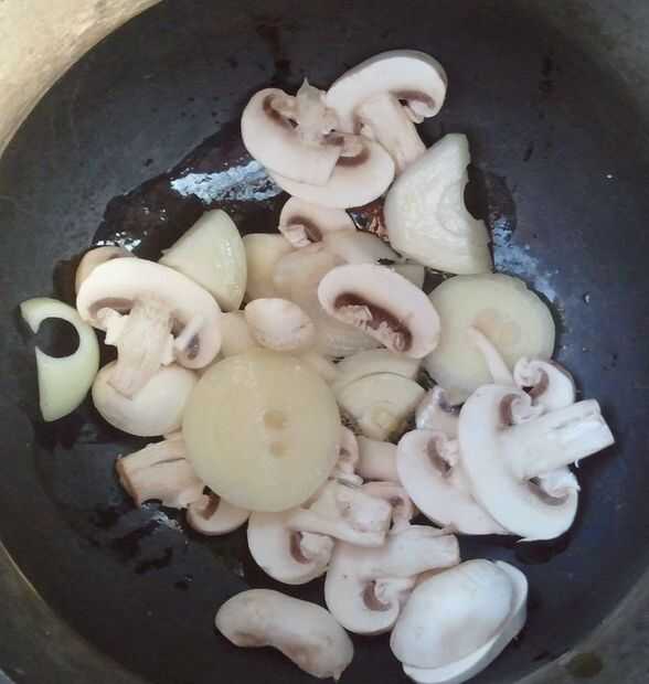 La capa 1 es la carne. Añadir un poco de aceite a la "potjie" y calentar hasta el punto donde fríe cebollas o champiñones. Utilicé 50ml de aceite, una cebolla picada y algunos hongos, pero todo depende del tamaño de su olla y la cantidad de gente que desea alimentar. Una vez que las cebollas y las setas son "freír" muy bien, agregar la carne y "Revolver" alrededor regularmente hacer todo agradable y marrón sellar la jugosidad de los alimentos.
