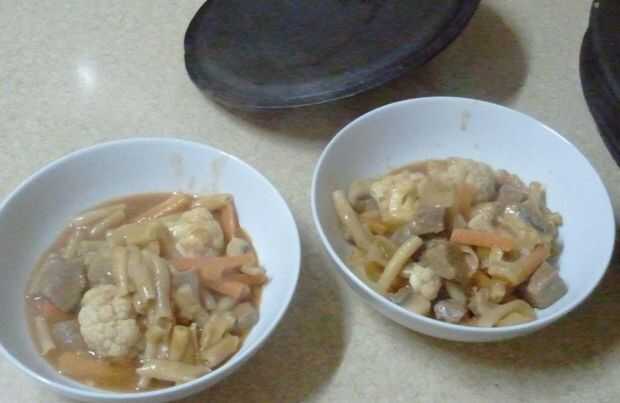 Después de unas 2 horas o más de simmering y burbujeo, es el momento de servir la comida. Ya se vuelve oscuro cuando empecé a preparar el "potjie" en horas de la tarde. He traído el "potjie" dentro pero la iluminación no era tan bueno. El video muestra la manera que el potjie debe burbujear cuando escuchaba. Me he quitado la tapa como me voy a servir la comida para mi familia. Bon Appetit todos! (La comida estaba deliciosa! La carne estaba muy suave y las verduras eran jugosas. Si no crees me pruébalo.)