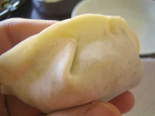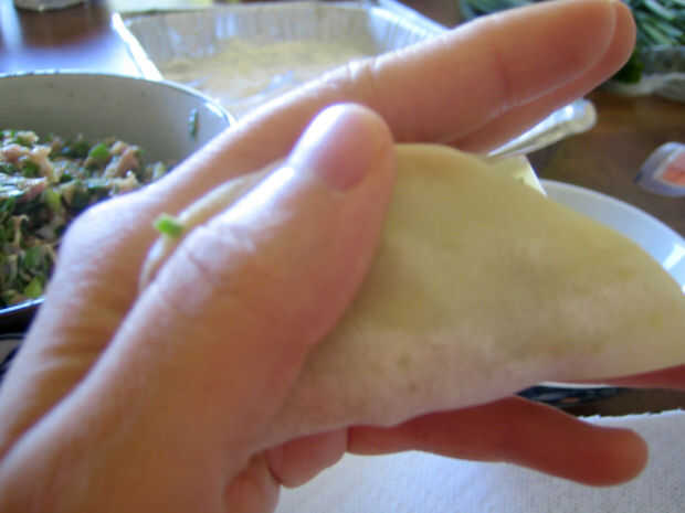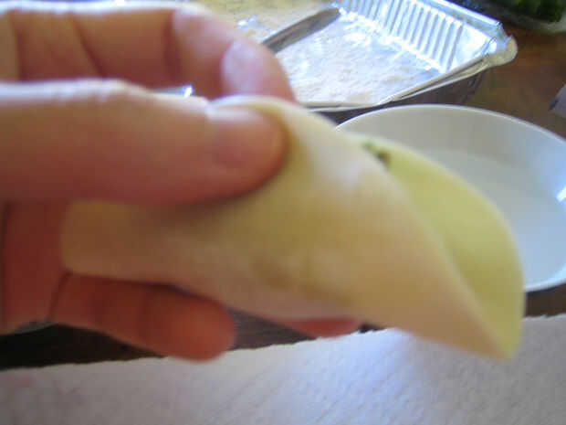 La envoltura de la bola de masa hervida * no es perfectamente redonda. Es realmente un óvalo. Alinee la envoltura de la bola de masa en la palma de su mano de manera que su eje mayor es paralelo a los dedos. Sacar con pala encima de una cucharilla colmada del relleno y ponerlo en el centro de la bola de masa hervida. El relleno debe ser ovoide en forma, con su eje mayor perpendicular al eje mayor de la bola de masa hervida. Esto hará mucho más fácil poner tanto relleno en cada bola de masa hervida como sea posible y aún sellar la envoltura con facilidad.