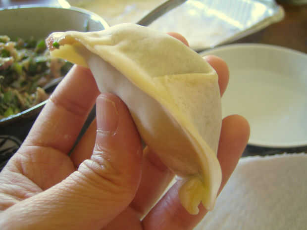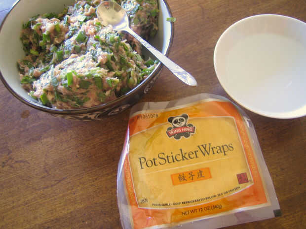 * Para aquellos de ustedes que también quieren hacer la envoltura desde cero, es muy fácil. Sólo mezclar harina y agua fría hasta que sea viable sin ser demasiado pegajosa. Poner la masa en la nevera durante un par de horas para que el resto de masa. Hacer las envolturas pellizcando de bolitas (aproximadamente 1" de diámetro) y aplanar con un rodillo. Envuelva con las envolturas hecha de antemano, excepto que no tienes que humedecer la envoltura tanto para sellarlo. Cuidar el envoltorio, porque envolturas frescas son muy elásticas. Wrappers caseros tienden a tener una textura más masticable que envasados los.