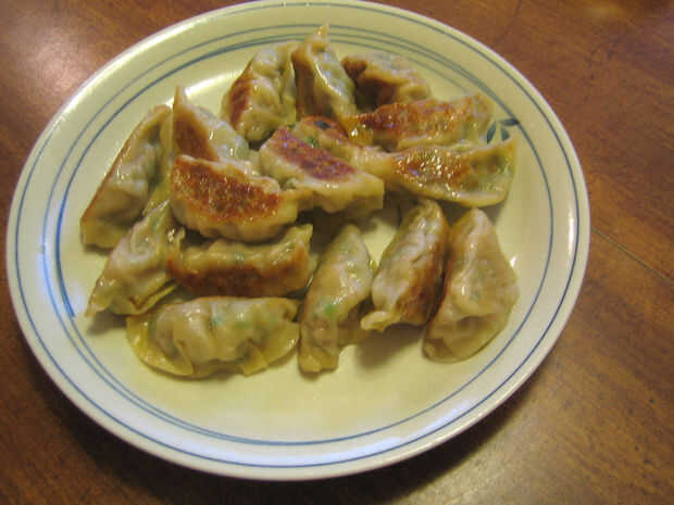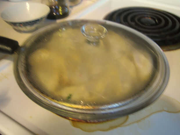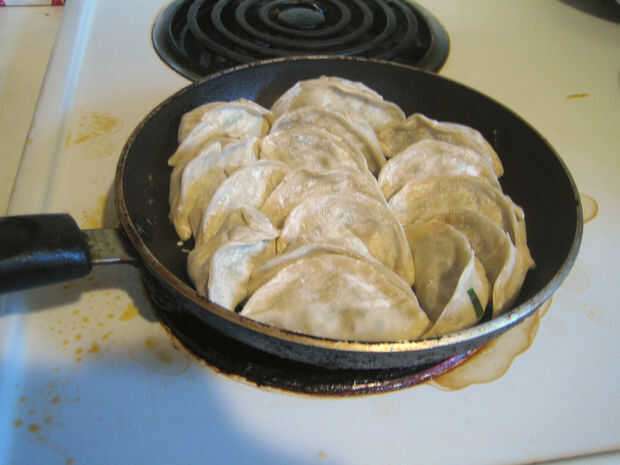 Añada suficiente agua en el recipiente para sumergir todas las bolas de masa hervida hasta la mitad. Gire el calor alto y cubrir la sartén con una tapa de vidrio. Asegúrese de que no levante las tapas a menudo después de este punto, porque las bolas de masa hervida son parcialmente cocidos por el vapor atrapado debajo de la tapa. Cocine las albóndigas hasta que toda el agua se evapora. Sus potstickers está listos!