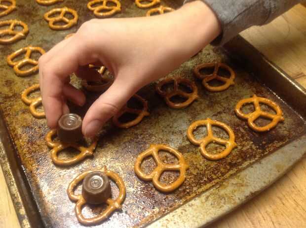 Poner los rolos vertical en la parte superior del pretzel y asegúrese de que caiga.