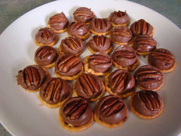 este postre es sencillo y fácil de hacer. Sería gran postre para llevar a una fiesta.Paso 1: Ingredientes y suministros Necesita rosquillas torcidos, rolo chocolates y nueces a la mitad. Usted también necesitará aerosol de cocina antiadherente y una