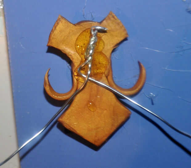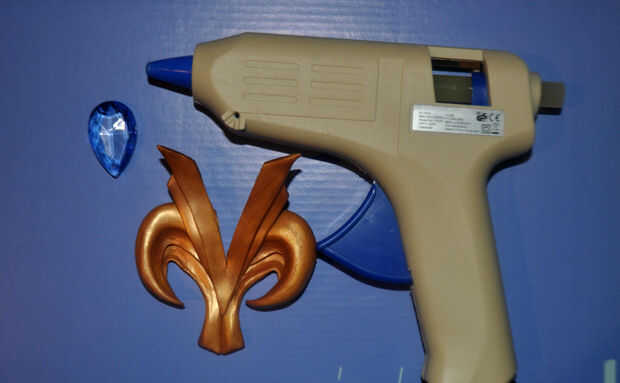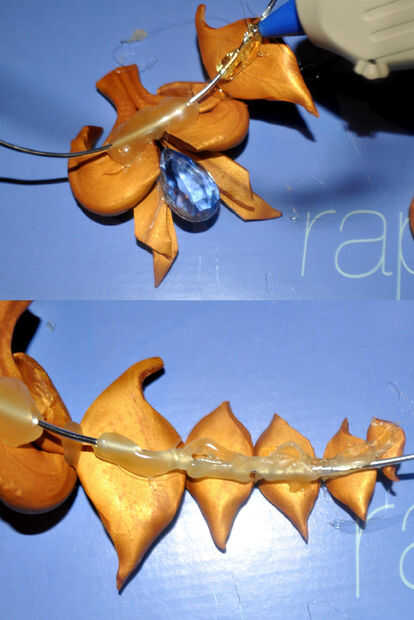 Utilice una pistola de pegamento caliente para pegar las piezas de arcilla de polímero curado al alambre. Luego pegue el rhinestone azul grande en forma de 'V'.