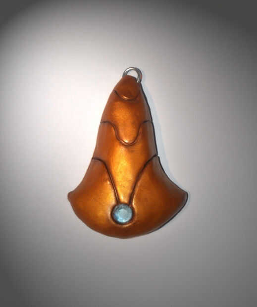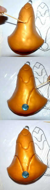 Una tortilla de arcilla polimérica del rodillo y cubrir el «peras de aluminio» a partir de la parte delantera. Alisa la arcilla con un bolillo. Utilice un palillo de dientes a tallar el diseño como se muestra en las fotos. Coloque el rhinestone azul y presione suavemente sobre la arcilla para asegurarse de que permanece en su lugar.