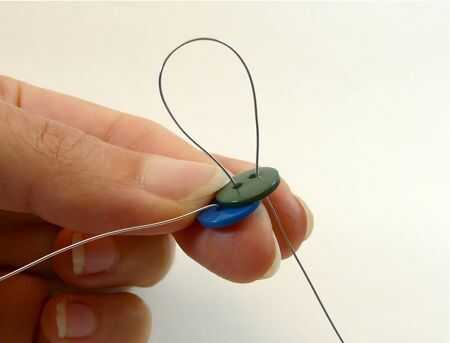 Deslice este nuevo botón en el alambre hasta que descanse contra la parte posterior del primer botón. Luego, coser el alambre hacia abajo a través del otro agujero otra vez y tire del cable ajustado.