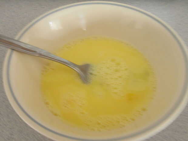 3. con una de las horquillas, batir la leche y los huevos hasta que los dos ingredientes estén completamente mezclados