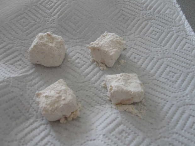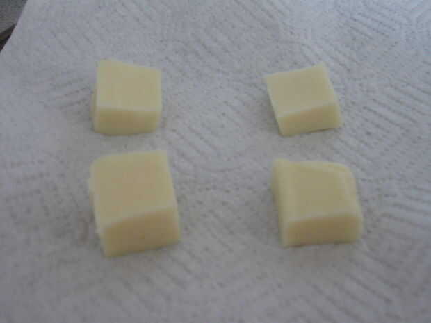 2. con el cuchillo y tabla para cortar, cortar el queso en cuadritos.