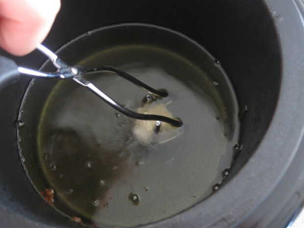2. sin dejar de sostener el queso con las pinzas, sumerja lentamente el queso en el aceite caliente