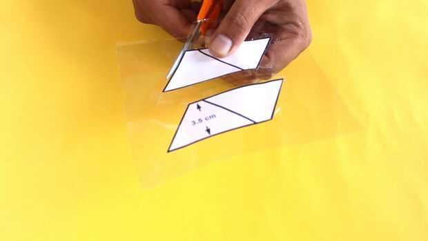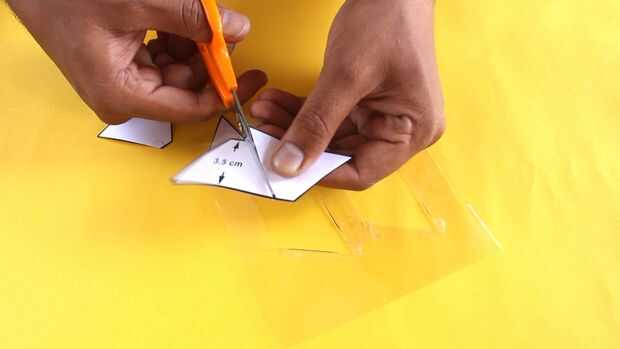 Hacer el mismo corte la plantilla y pegar sobre la tapa de la hoja o archivo de polietileno claro y cortarlas con tijera entonces palillo cuatro porciones utilizando yeso obtenemos la forma de pirámide