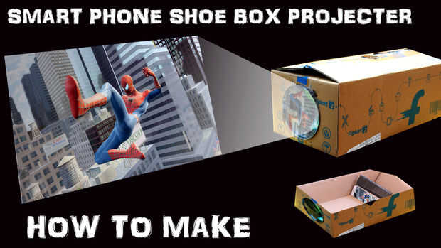 Tome la caja de zapatos vacía y una lupa en el arreglo de caja de zapatos vacía la lupa en la parte superior y dentro de la caja reproducir el vídeo en el teléfono inteligente en el revés de la posición.