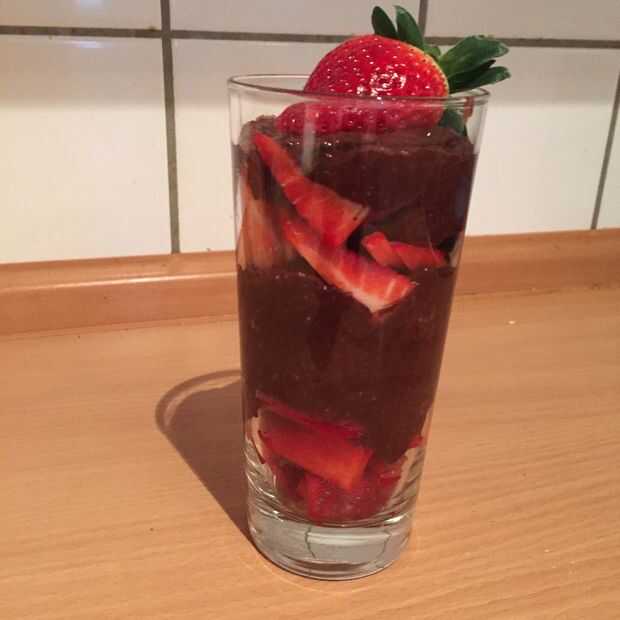 Así que enjuague y pique sus fresas (puede usar cualquier otra fruta que crees pares bien con el chocolate!) Capas primero las fresas.