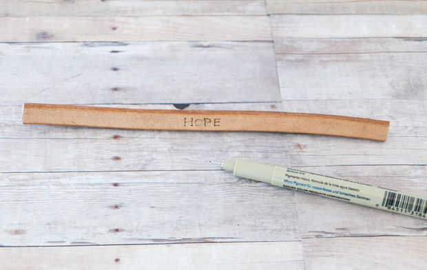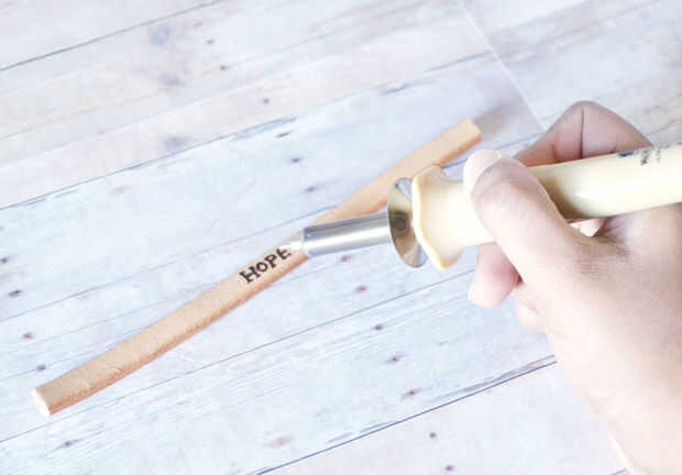 Escriba la palabra que desee en el medio, en mi caso es "La esperanza". Que usa una pluma para escribir la palabra en el centro de la banda y se convirtió en la herramienta de grabación para calentar. Utilice punto Universal para escribir cartas. También puede utilizar la pieza recortada para el juicio para saber cómo reacciona el cuero con el herramienta de leña. Lo que observé es, necesita ser rápido cuando se utiliza la herramienta sobre la piel. Era tan suave y se sentía como yo estaba usando un rotulador para escribir en la piel. Se quema tan rápido en comparación con la madera y así planificar antes de iniciar el proyecto. Una vez que la herramienta se calienta, quema la palabra con la herramienta.