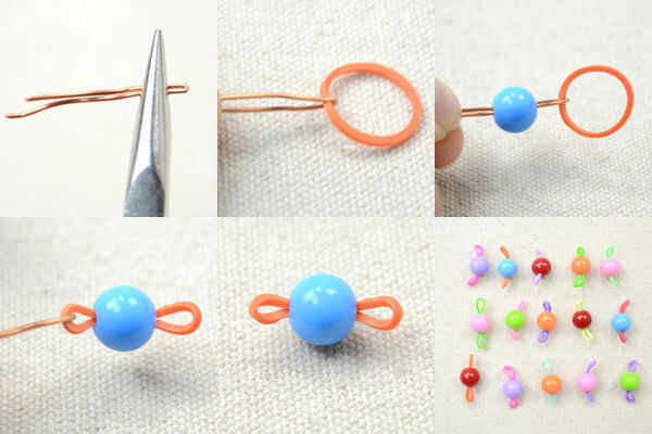 1 preparar una tira de acrílico de 10mm, una banda de caucho y un aprox. 10cm 8mm-alambre de cobre, doblar el alambre de cobre por la mitad y pellizcar el cable firmemente con alicates planos, una banda de goma entre el cable del hilo de rosca, deslice el cable para el grano, tire de ella hacia el otro lado pero deja la banda dentro del grano. Deslice el cable de la perla. Repita el procedimiento para hacer otros enlaces 14 grano