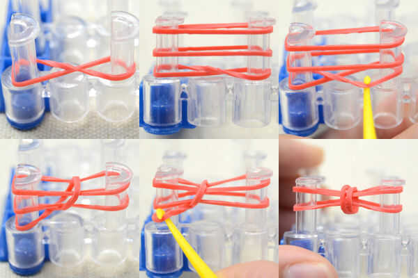 2, lazo una cinta de goma a clavijas girándolas para hacer una figura ocho, añadir dos gomas, tire de la banda inferior sobre las superiores dos bandas en dos lados;