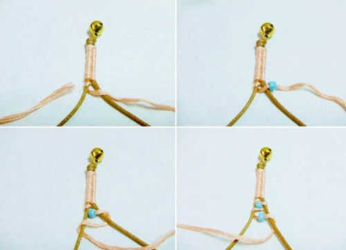Los hilos de la trenza como se dijo anteriormente; atar y cortar un extremo del hilo. Traiga el hilo hacia la izquierda y a la derecha. Deslice una tira. Traiga el hilo hacia abajo para el cable de la derecha y abajo a la izquierda. Deslice el otro talón.