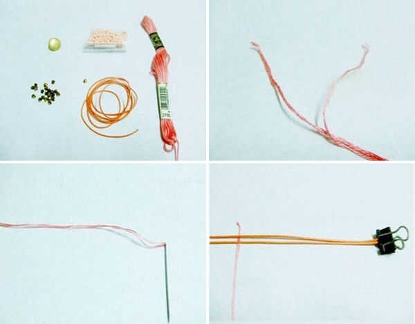 Preparar los materiales necesarios en el cuadro 1. Enhebrar una aguja un hilo rosa. Cortar uno de los extremos de dos cuerdas de cuero con un clip. Llevar el extremo anudado de los hilos en el orificio de las cuerdas.