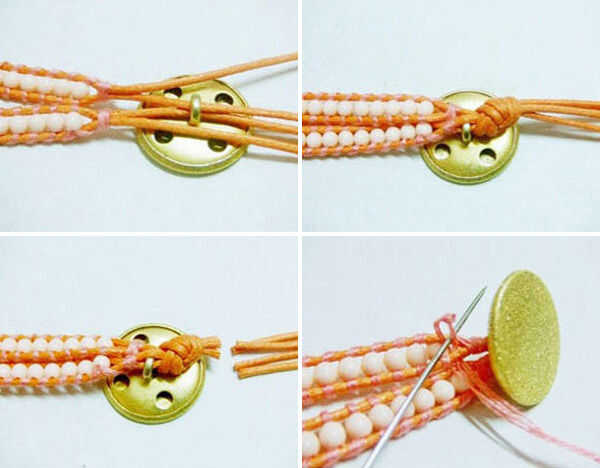 Los dos cables del centro a través del agujero de botón del hilo de rosca. Hacer juntos solos nudos con cuatro cuerdas. Corte las cuerdas redundantes. Enhebre la aguja en el extremo anudado a unir los cables de mediados.