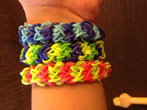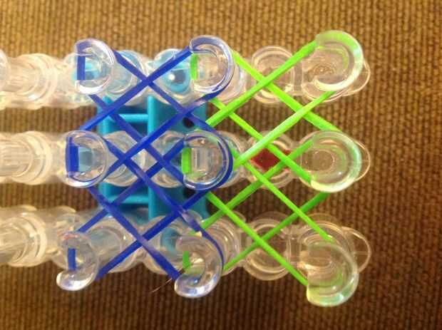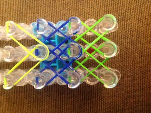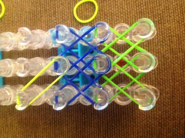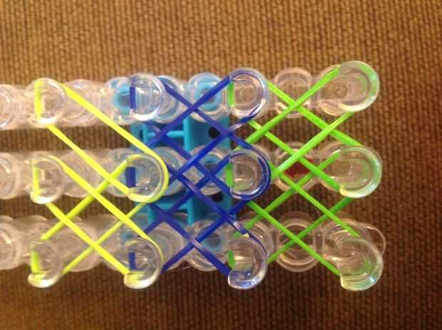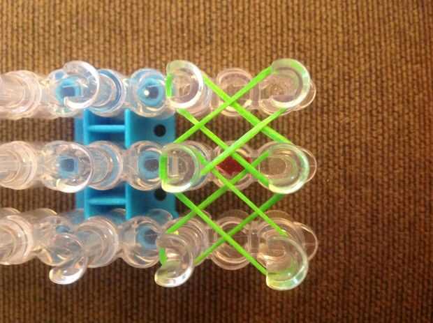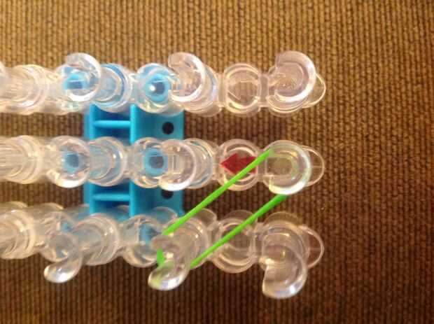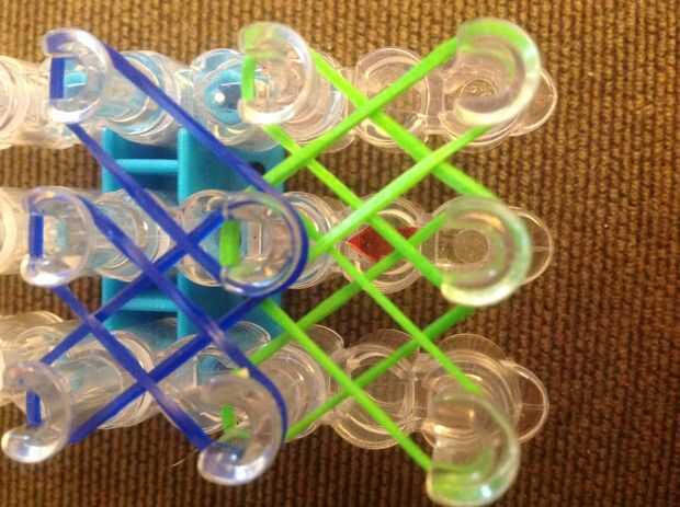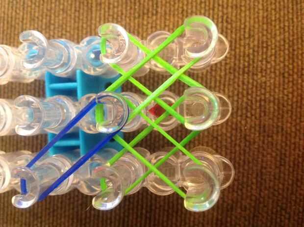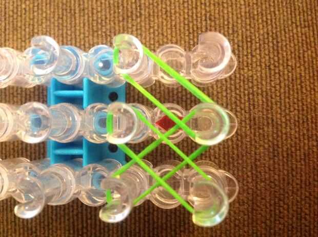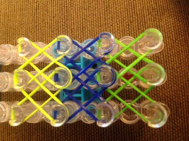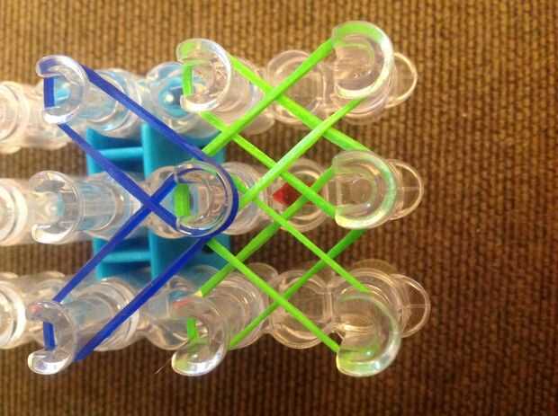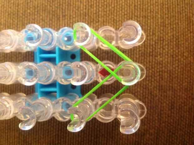 Primero consigues una banda de caucho (verde) va en la clavija media y poner diagonalmente hacia arriba a la izquierda y luego de la misma a la derecha.