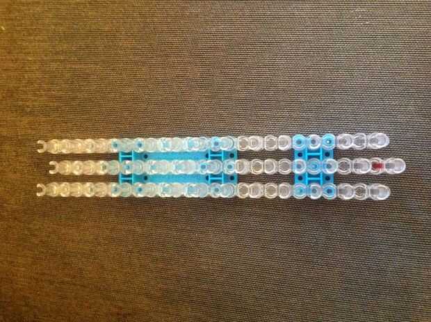 he modificado este video tutorial para crear una pulsera bigote! ¡ Disfrute!Paso 1: Se necesita: una tira de las clavijas de un telar del arco iris, dos colores de bandas (mina son de color rojo para las bandas de encuadre y plata para las bandas de