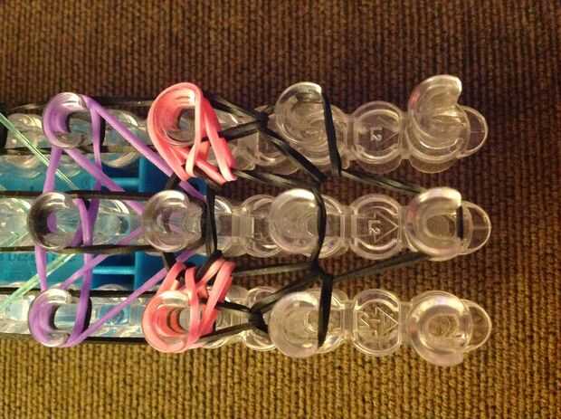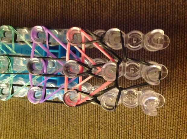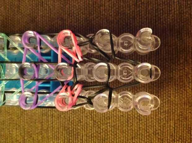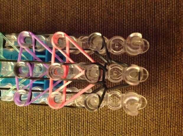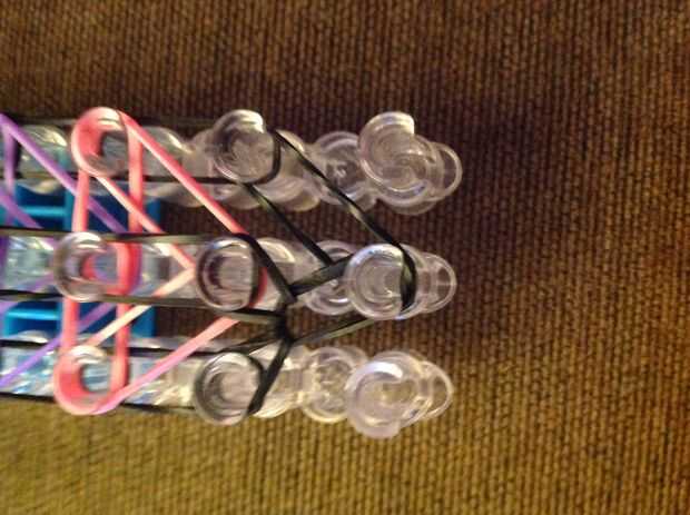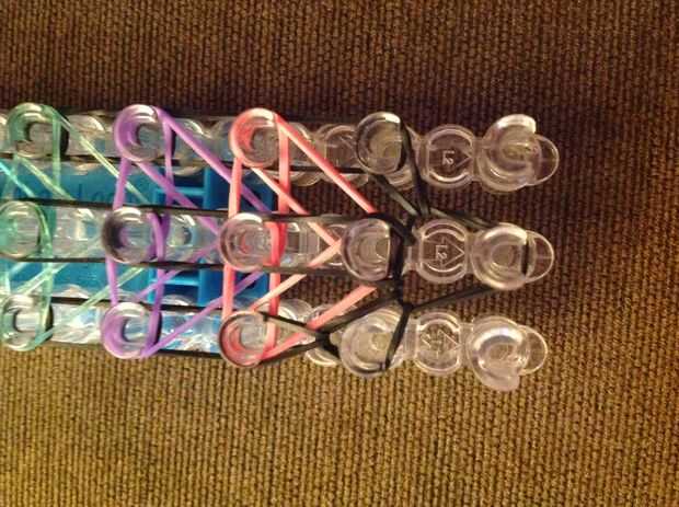 * punta si esta es su primera vez haciendo e intermedio nivel pulsera sugiero usar los mismos colores.Primero consigues una banda de caucho (verde) va en la clavija media y poner diagonalmente hacia arriba a la izquierda y luego de la misma a la dere