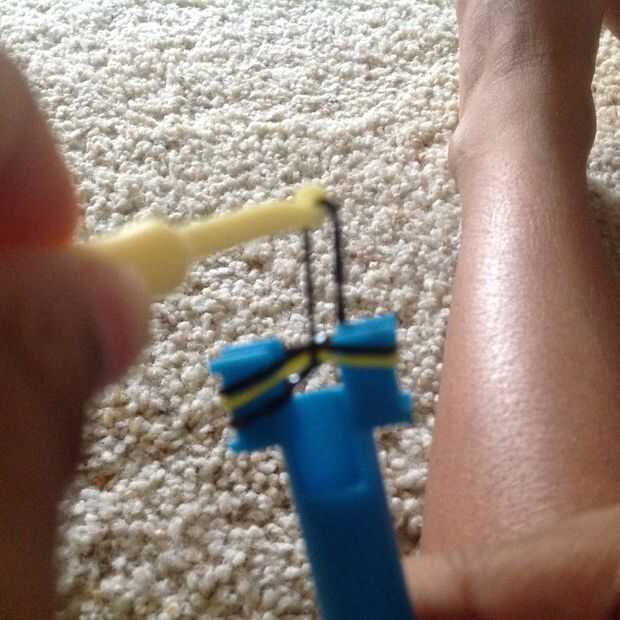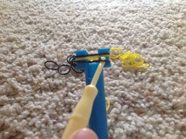 * punta si esta es su primera vez haciendo e intermedio nivel pulsera sugiero usar los mismos colores.Primero consigues una banda de caucho (verde) va en la clavija media y poner diagonalmente hacia arriba a la izquierda y luego de la misma a la dere