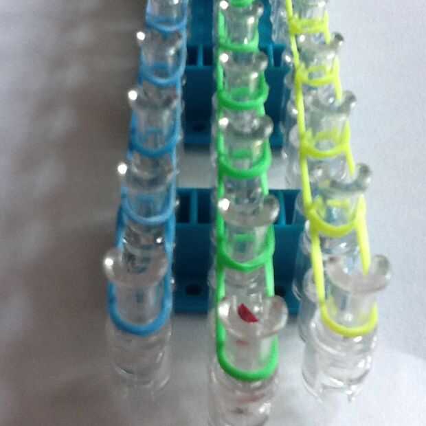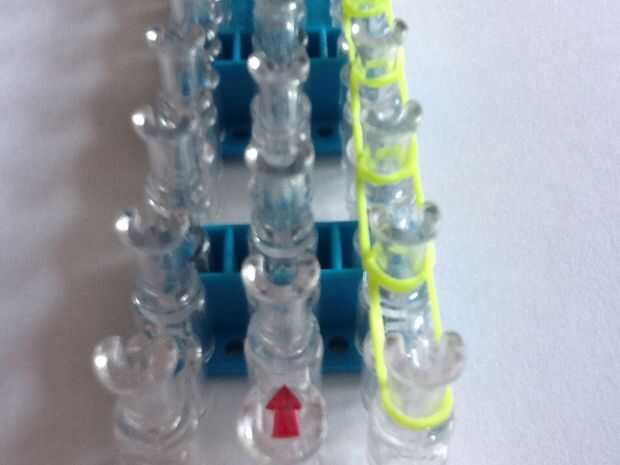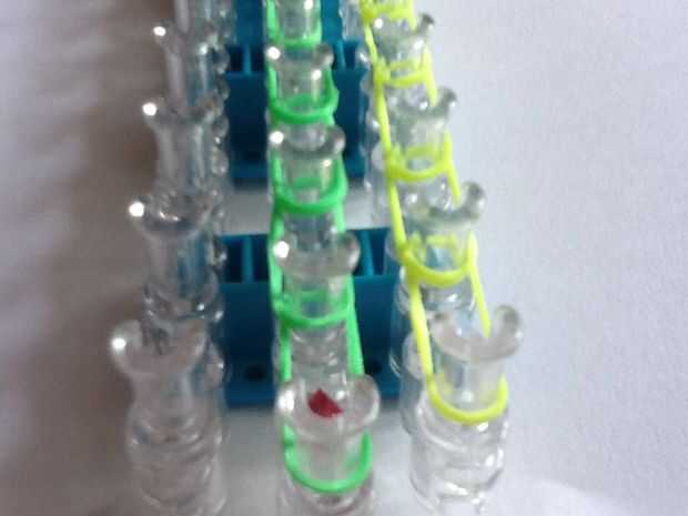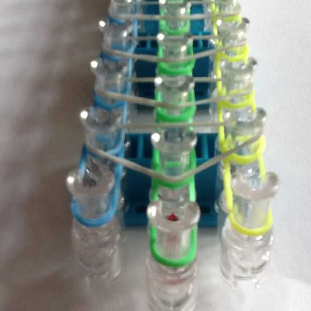 En primer lugar elegir un color de bandas y comenzar a poner en las clavijas a la derecha, coloque abajo del telar. Luego toma otro color de bandas y poner en el centro Coloque abajo del telar. Ahora puede elegir un color más y coloca abajo del telar. Finalmente, elegir un color, uso gris o blanco, omitir las tres primeras clavijas y hacer una boca don triángulo de tres clavijas, hacer todo el camino hasta el telar.