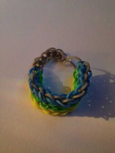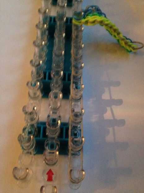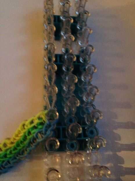 Primero poner algunas bandas en las clavijas estoy usando 7 pero puede usar tantos como necesita para adaptarse a la muñeca. Vuelva a colocar la pulsera en la última clavija y ponga su gancho que peg y agarrar la parte inferior de banda y lo remite, hacer todo el camino hasta el telar. por último haz un clip c y ponerlo en el extremo de la cadena, luego conecte al otro lado de la pulsera.