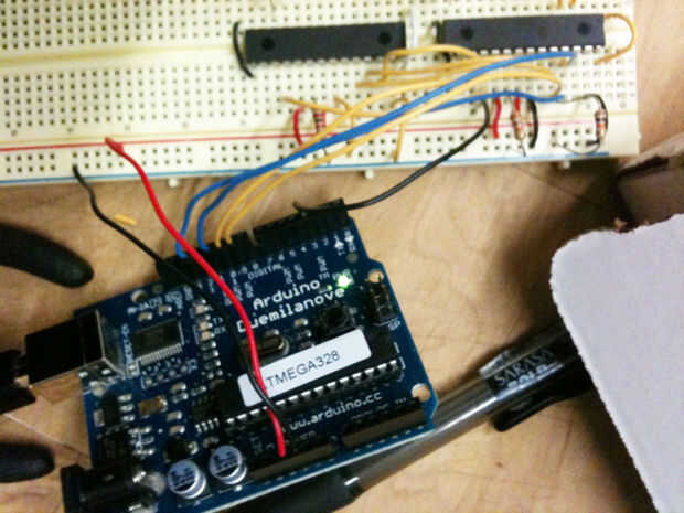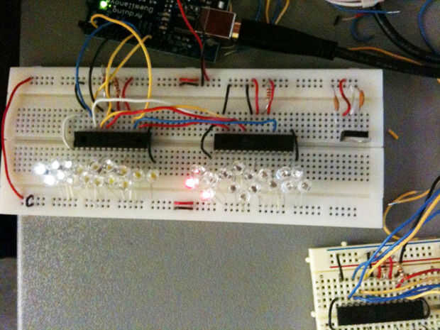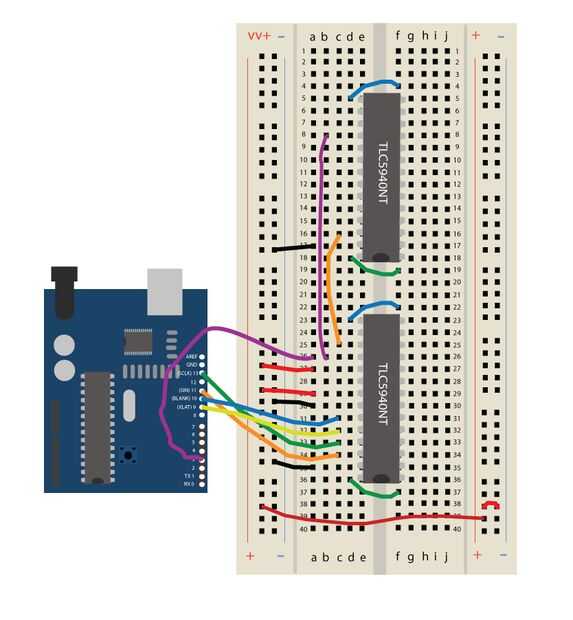 3. la prueba; para asegurarse de que si el circuito está configurado correctamente ejecutar código BasicUse en playground de Arduino TLC 5940 biblioteca ejemplos. El ejemplo utiliza dos TLC 5940 controladores.