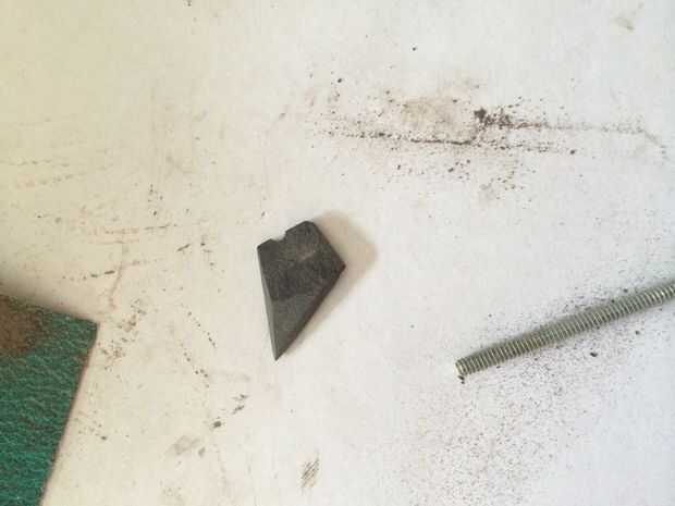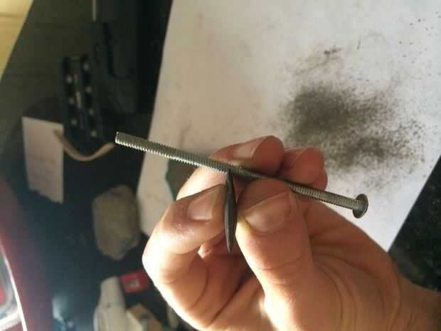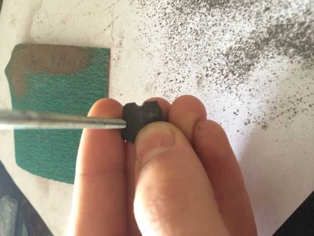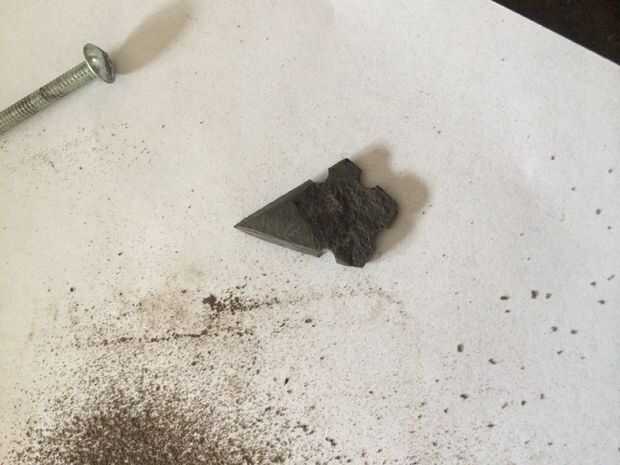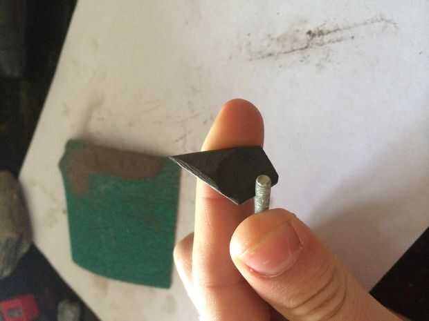 Este paso no es totalmente necesario, pero hace que la punta de flecha se vea mejor y resulta más fácil unir a una punta de flecha. Sólo hice este paso con la punta de flecha de tierra porque este paso se incluye en la talla. Tomar el tornillo o perno (va a utilizar un tornillo pequeño) un seguro que el diámetro es de aproximadamente 1/4 de centímetro. Luego colocarlo perpendicular al borde inferior de la punta de flecha como muestra en la imagen. Ahora frote el perno y el borde con una ligera presión. Como los hilos de rosca del perno rozar la piedra debe sacar virutas pequeñas y hacer un guión como usted puede ver en las fotos. Una vez que el guión es una profundidad decente (sobre un tamaño de medio círculo) repetir en el otro lado. Puntas de flecha más normales necesitan sólo un guión en cada unidad de negocio de lado porque la mina tiene un acentuado fondo voy a añadir dos guiones más. No dude en hacerlo para más estabilidad cuando coloque la punta de flecha en un eje. También puede un ángulo el tornillo ligeramente mientras frotaba para hacer el guión más redondeado y el borde de lo más opaco para que no corte la cadena si lo conecta a una flecha. Ver las fotos para una mejor explicación de esto.