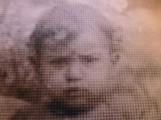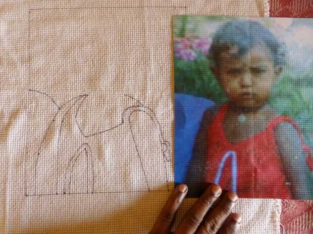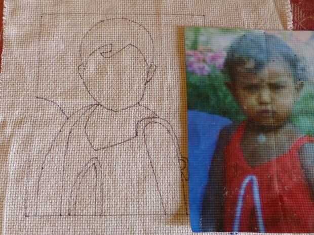 Aquí he tomado un color de impresión de la imagen de bebé y puesto en una cuenta 14 tela Aida. La imagen ampliada le mostrará el patrón de la armadura correspondiente. Me he trasladado también el contorno del bebé sobre la tela Aida. Si quieres hacer tu punto de Cruz, también se puede activar la imagen en escala de grises como se muestra aquí.