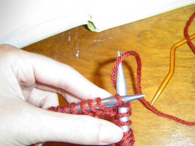 Para tejer, sujete la aguja con el reparto de puntos de sutura en su mano izquierda, con el hilo principal detrás de su trabajo y fuera a la derecha. Usted debe sentirse cómodo con las agujas como manubrio de bicicleta.
