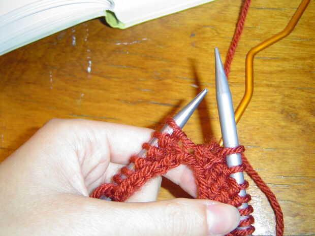 Tomar la otra aguja en la mano derecha y colóquelo en la puntada en el extremo de la aguja izquierda de izquierda a derecha.