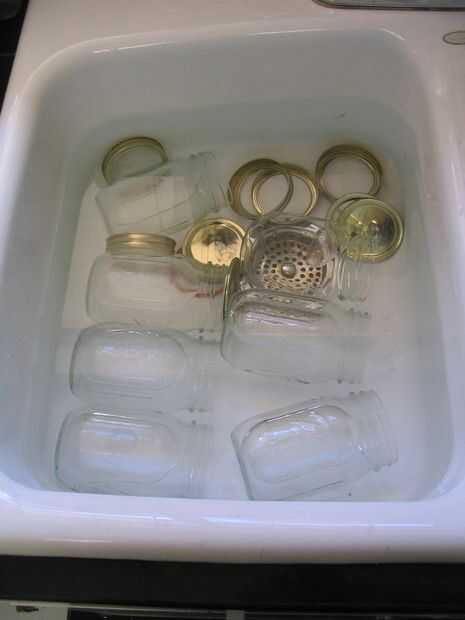 Mientras tanto, preparar los frascos y las tapas: frascos de lavado a mano o en el lavavajillas, luego coloque en un fregadero limpio llenado de agua muy caliente hasta que esté listo para su uso. Añadir anillos limpiamos y tapas; no recorren las tapas el lavavajillas.
