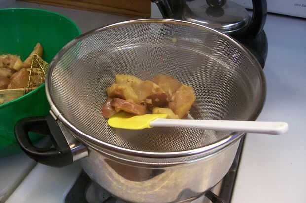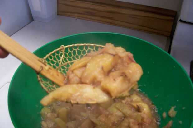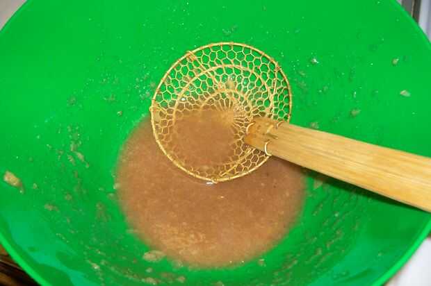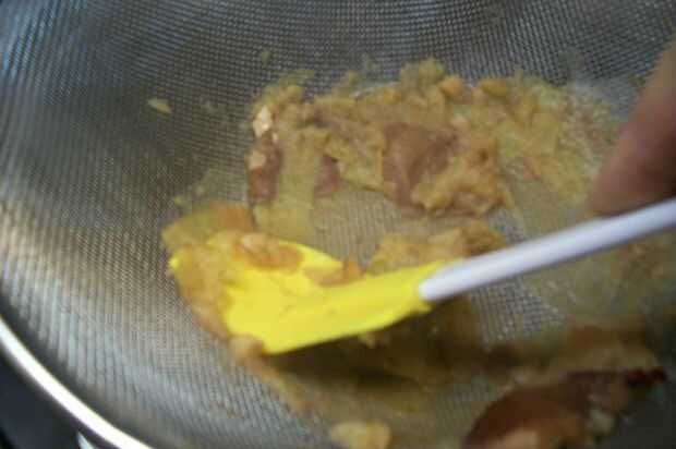 Con el filtro de mango o la cuchara ranurada, cuchara una pequeña cantidad de las manzanas y ponerlas en el pasapurés o colador. Deja el jugo en el recipiente, añadiremos más tarde.