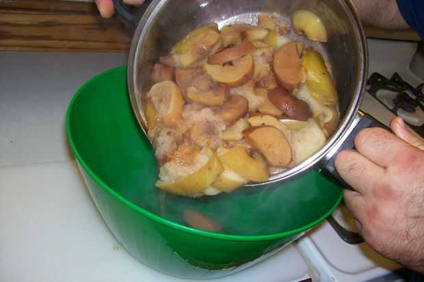 Después de que has puré de todas las manzanas cocidas a través de usted molino o colador, vuelva a colocar las cáscaras y las semillas en el recipiente con el jugo. (¿Guardar el jugo, derecho)? Revuélvalo para conseguir todos los trozos de manzana en el jugo, luego vierta esa mezcla por el pasapurés o colador para obtener la última poco en la olla.