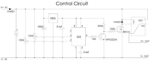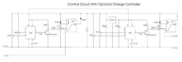 Este circuito es una versión modificada de un circuito de regulador de carga que fue diseñado por Mike Davis (http://www.mdpub.com/555Controller/index.html). En el circuito original, un IC 555 temporizador fue utilizado para desconectar una batería del panel solar cuando su voltaje es muy alto (para evitar sobre carga). En mi diseño, el circuito de control conecta la batería a un inversor y un circuito de salida cuando la batería esté completamente cargada.