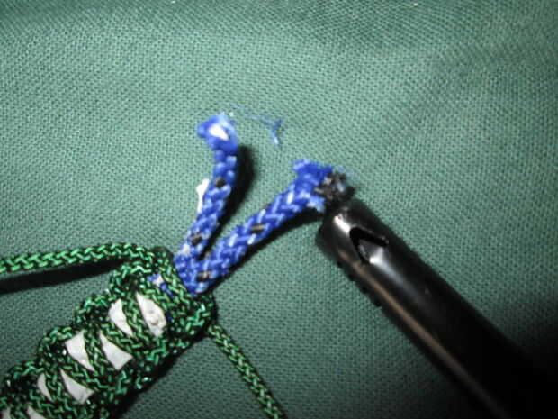 Ahora que tiene la cobra de la armadura hacia abajo, cortar los extremos cerca de la cuerda y derretir los extremos para que no bajan. Luego derretir el paracord azul para que no se desentraña.