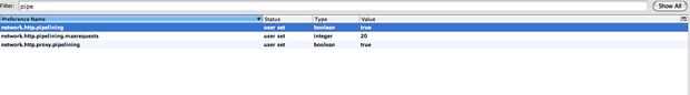 Una vez allí, en la barra de filtro, tipo de tubería. Te saldran 3 resultados, network.http.pipelining