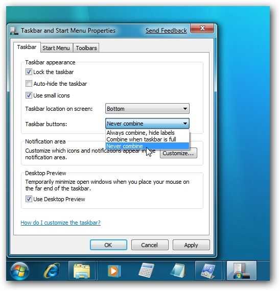 Tenemos que reducir los iconos y hacer la lista de la ventana nunca combinar en botones. Tendremos que abrir la ventana de propiedades haciendo clic derecho sobre la barra de tareas y seleccionando "Propiedades". Marque la casilla que dice 'Iconos pequeños de uso' y seleccione 'Nunca combinar' de la lista desplegable botones de la barra de tareas.