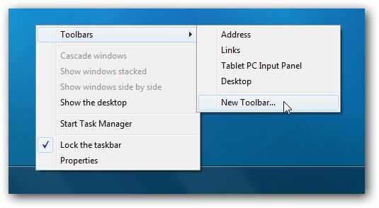 Ahora, haga clic en la barra de tareas y en las barras de herramientas -> nueva barra de herramientas... Se abrirá una nueva ventana del explorador. Haga clic en la barra de direcciones y pegue