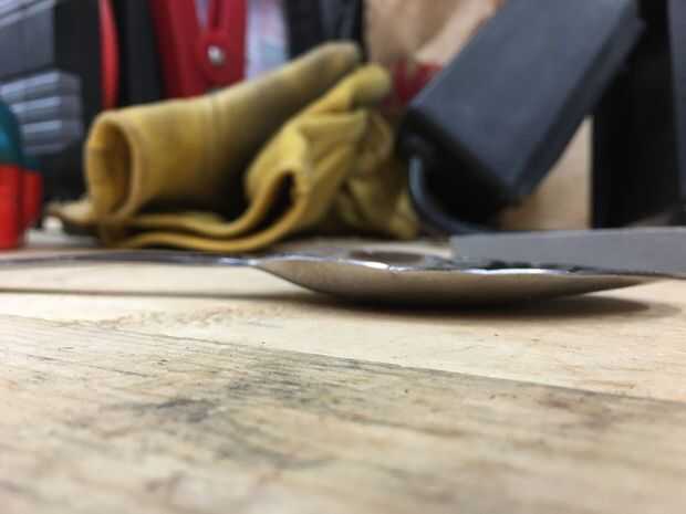 He utilizado una cuchara de cafetería que era un metal ligero y itI aplanado utiliza un hacha afilado de archivo en el punto inferior y la parte superior redondeada.