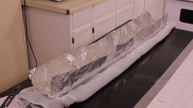 A continuación, vamos a crear una forja para la fabricación de nuestra lámina poniendo a algunos por lo menos tan largo como la hoja de la plantilla de papel de estaño y doblar en tres partes y desplegarlo para crear un canal en U que la hoja se puede calentar en.